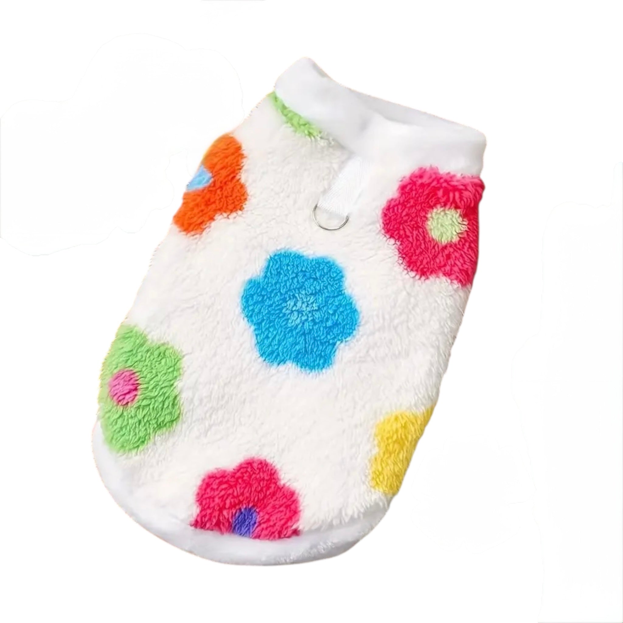 Mantén a tu mascota abrigada y con estilo con este suéter de felpa suave, ideal para perros y gatos de todos los tamaños. Su colorido diseño floral sobre base blanca lo hace único y alegre. Perfecto para otoño e invierno, es cómodo, cálido y lavable a máquina. ¡Moda y confort en una sola prenda!