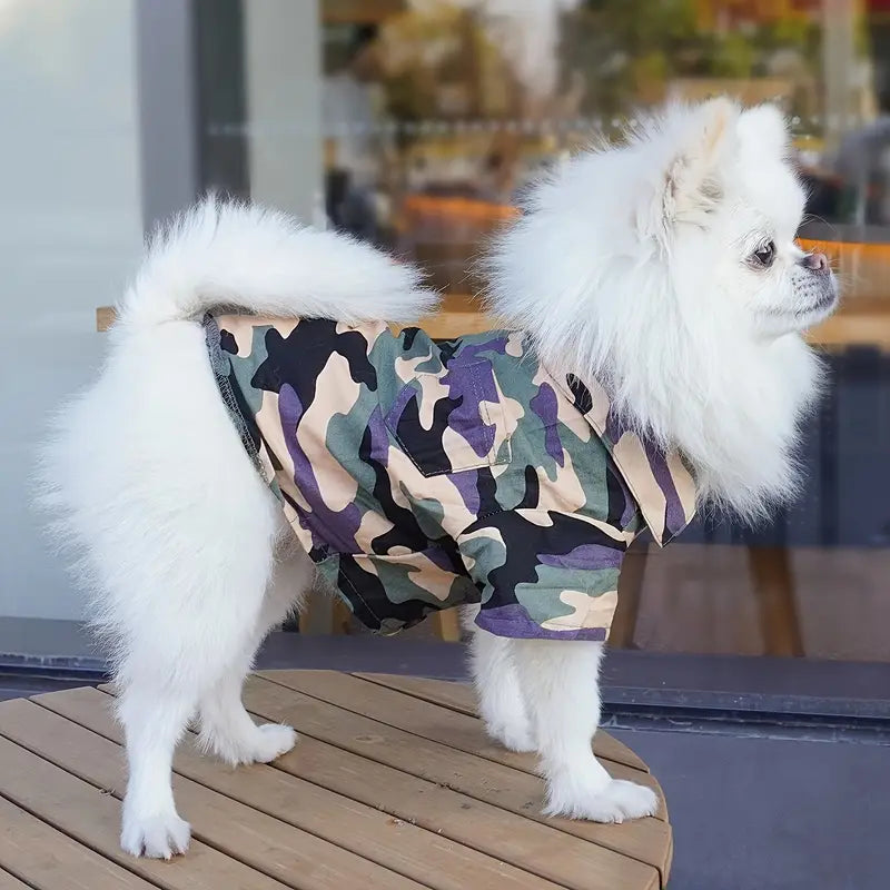 Esta camiseta camuflada para perros pequeños y medianos combina estilo urbano y confort. Hecha de algodón suave y transpirable, incluye un bolsillo trasero funcional y es lavable a máquina. Ideal para la primavera, verano y otoño, es la prenda perfecta para que tu mascota luzca genial en cada paseo.